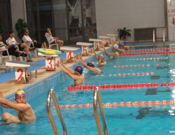 在6月11日迎来了本学期的最后一项活动游泳比赛,下午5点30分,我系24名运动员准时来到游泳馆,开始热身准备比赛。